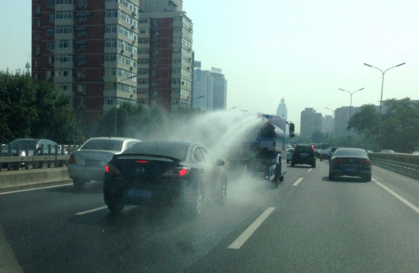 啼笑皆非!車主尾隨灑水車“蹭水洗車”