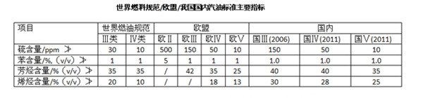 汽油標(biāo)準(zhǔn)主要指標(biāo)國(guó)內(nèi)外對(duì)比圖這意味著中國(guó)當(dāng)前的汽油標(biāo)準(zhǔn)是歐洲、日本的15倍,美國(guó)的5倍,柴油則是歐日標(biāo)準(zhǔn)的30余倍。這里的標(biāo)準(zhǔn),說(shuō)的是規(guī)定上的標(biāo)準(zhǔn),而執(zhí)行上的情況,低得更加慘烈,2012年《齊魯晚報(bào)》在山東隨機(jī)抽取了6份93號(hào)汽油樣品,其中有2份汽油的硫含量高達(dá)680ppm、910ppm。